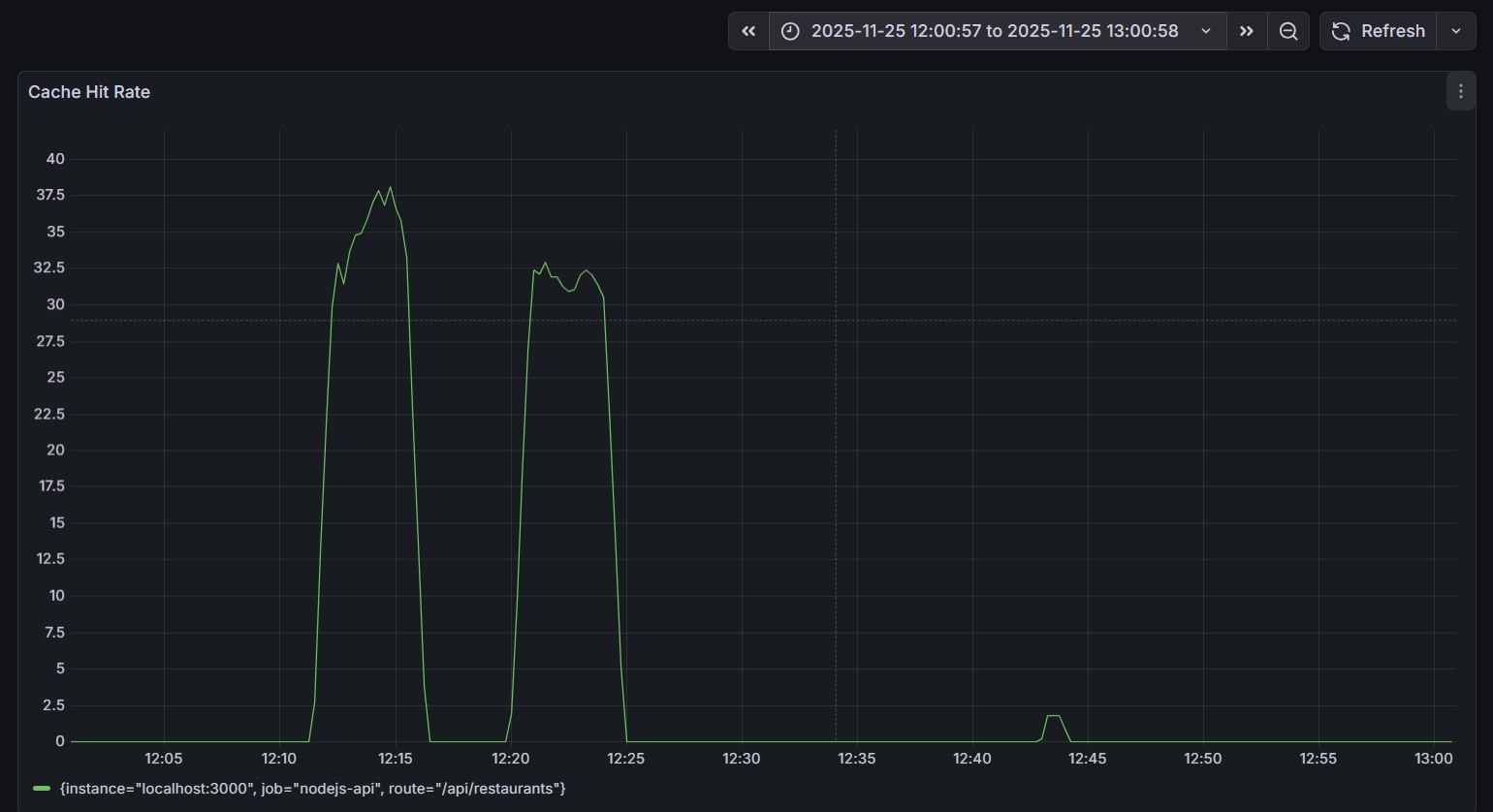 The impact of Redis on performance deserves special attention. The Cache Hit Rate chart during the testing period shows two distinct peaks of activity: