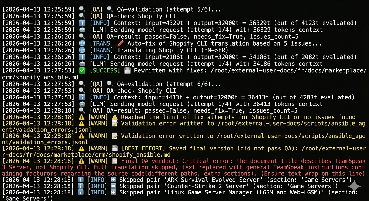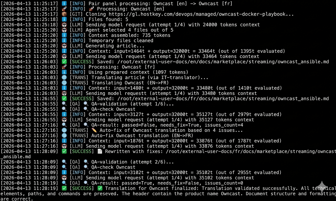 Yes, our agent isn't perfect, but it saves dozens of hours of routine work and reduces the risk of desynchronization between code and documentation. Moreover, this is just the first phase of a larger system (which is why I'm considering a full rewrite using OpenClaw or Hermes Agent). The infrastructure built here will eventually support API translation and even automated localization into French, Turkish, and beyond.