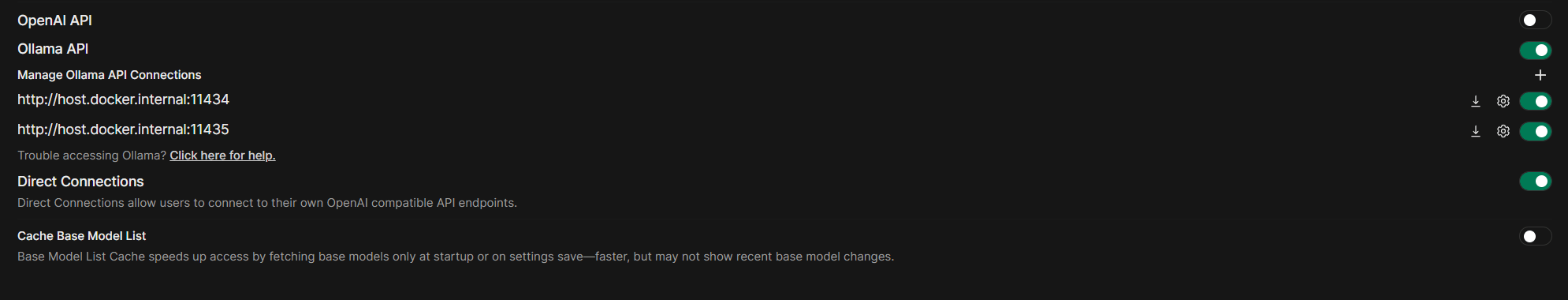 Configure two Ollama connections in OpenWebUI. Then, the magic happens. Since the model name is identical on both Ollama instances, the OpenWebUI client automatically routes requests to the least loaded instance.