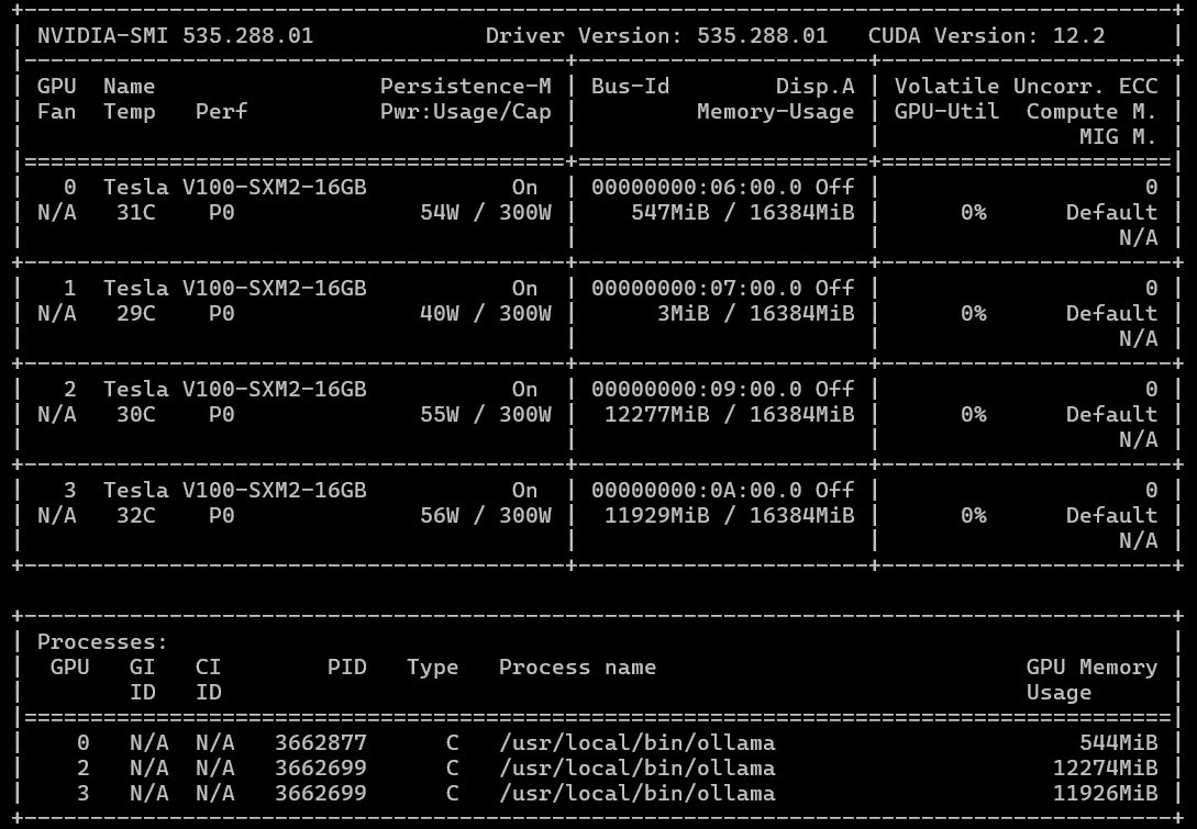 Run two Ollama instances in parallel. We achieved this using two separate systemd services. The first instance utilizes GPUs 0 and 1, while the second uses GPUs 2 and 3, sharing a common model directory. The advantage of this setup is that Ollama updates require no manual intervention; services restart automatically. To prevent conflicts, we run them on different ports.