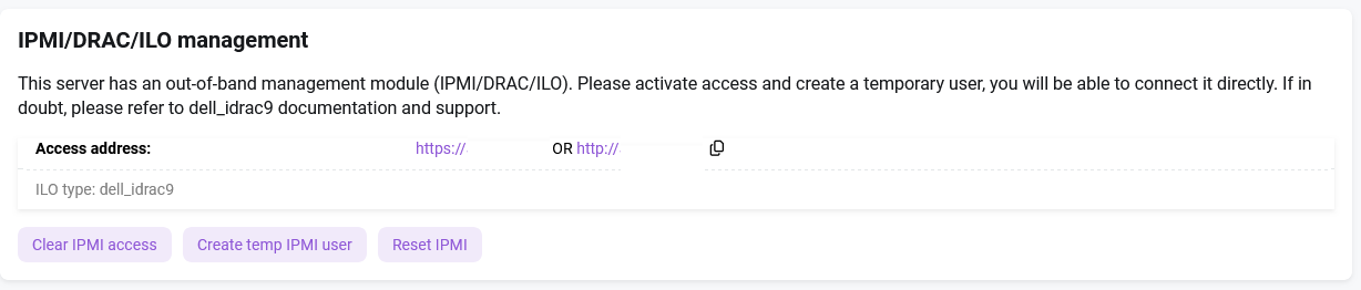 Once the IP ACL field is filled in, click the Activate IPMI access button. The system will forward the IPMI private address externally, create a temporary user, and display the access address with login credentials.