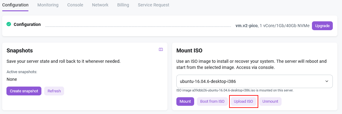 Go to the Configuration tab >> Mount ISO Image and click the Upload Your Image button: