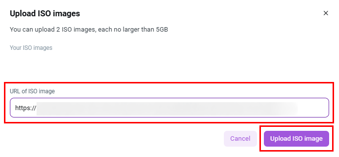 Enter the URL of your ISO image. For example, you can use official distribution repositories, such as CentOS.org, to download a CentOS image, or use file storage services.
