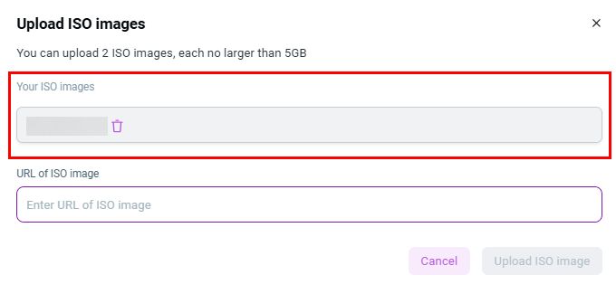 Limitations for uploading ISO images for a single client account: - Maximum number of ISO files: 2 files; - Maximum size of each ISO file: 7 GB.