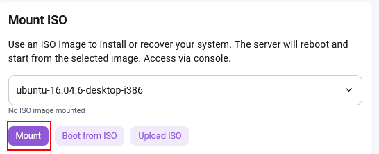 After selecting the operating system, click the Mount and Boot from ISO buttons:
