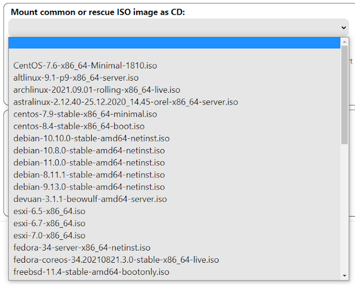 The Mount a standard or recovery ISO image as a CD section is available only when managing virtual servers and Supermicro hardware with X10 and X11 motherboards (and in some cases X9). In this tab, you can select an ISO with the required operating system from the dropdown list: