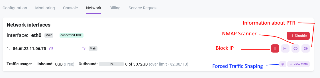 The Network tab allows you to block and unblock specific IP addresses, view port usage graphs, access network configuration details, and manage PTR (rDNS) records.