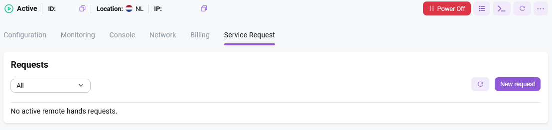 The Server Help tab displays the history of support tickets. This tab allows users to track their support requests, view the history of tickets, and receive updates on current issues: