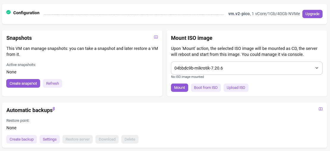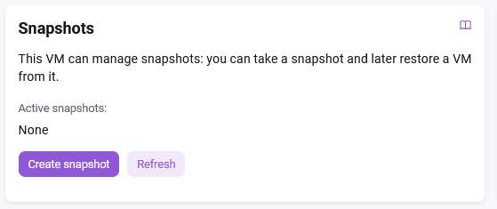 This section allows you to manage virtual machine snapshots. It provides a convenient interface for creating backups of the VM state and restoring from them when necessary.