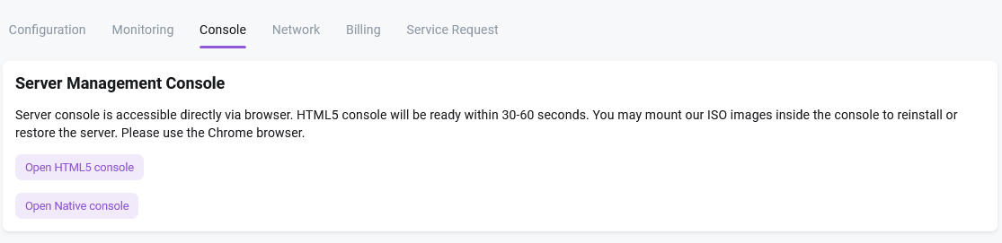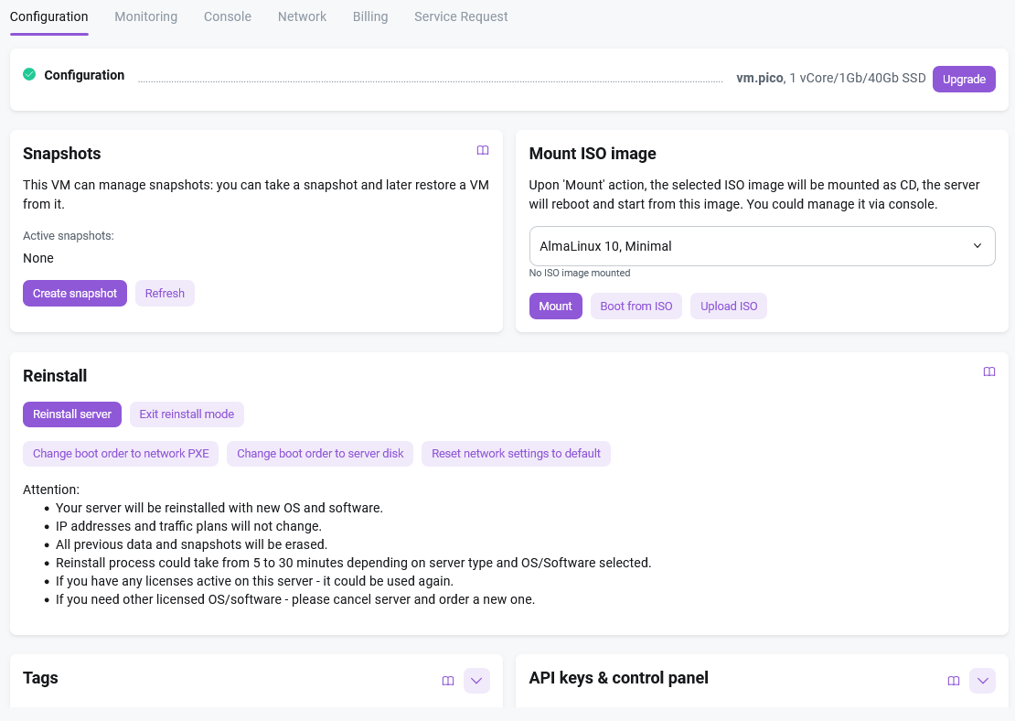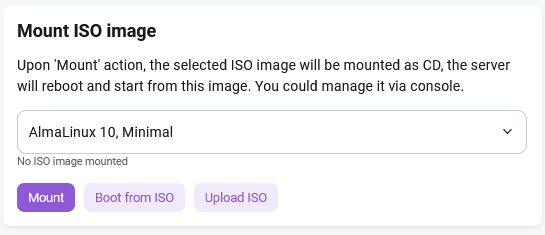 This section allows you to install one of the provided ISO files. Select an image from the list (loading the list may take a few seconds), click the Mount ISO button, and then Boot from ISO. The virtual server will stop and then restart using the ISO image as the boot device. After the server restarts, you must obtain a new console access file.