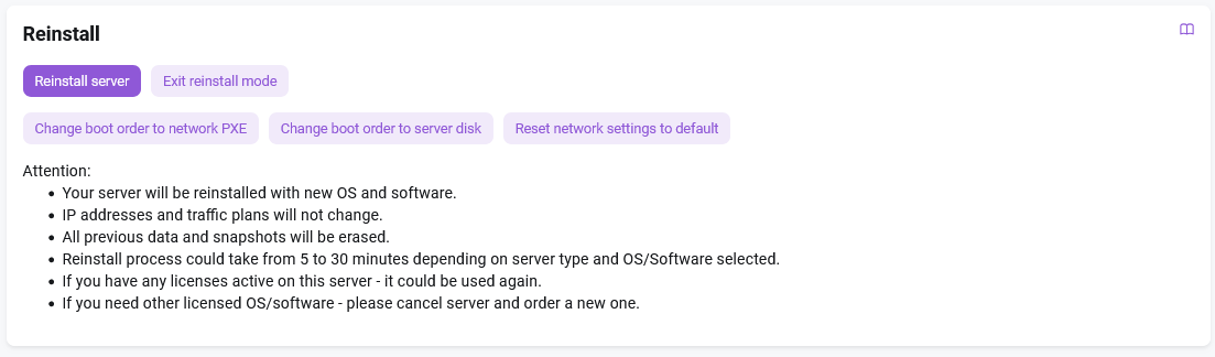 The Reinstallation section is designed to initiate reinstallation, select the operating system and additional software, and perform other reinstallation-related operations.
