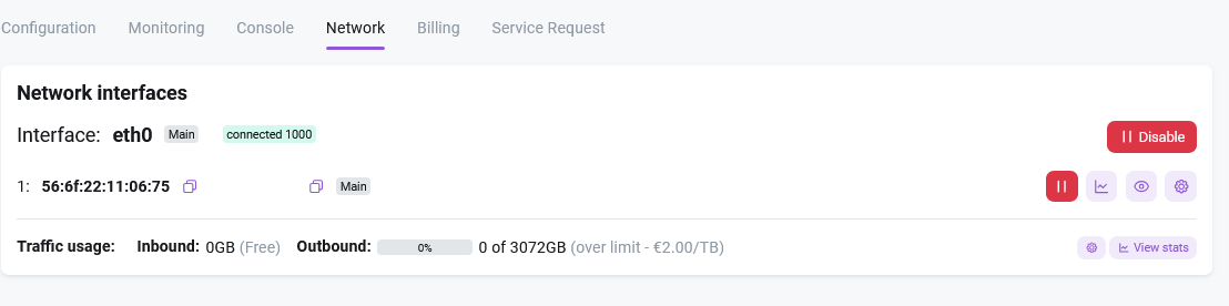 The Network tab allows you to block and unblock specific IP addresses, view port traffic graphs, view network settings, and manage PTR (rDNS) records.
