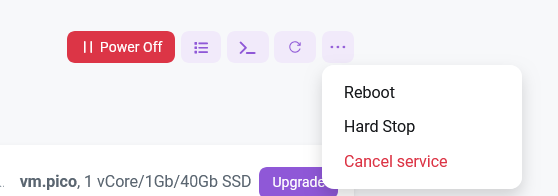 Clicking the ... symbol activates the quick server power management mode; this menu is also used to cancel services.