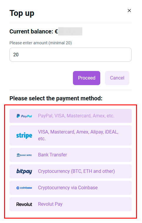 In this menu, the user must specify the top-up amount (minimum amount - 20) and select a payment method: