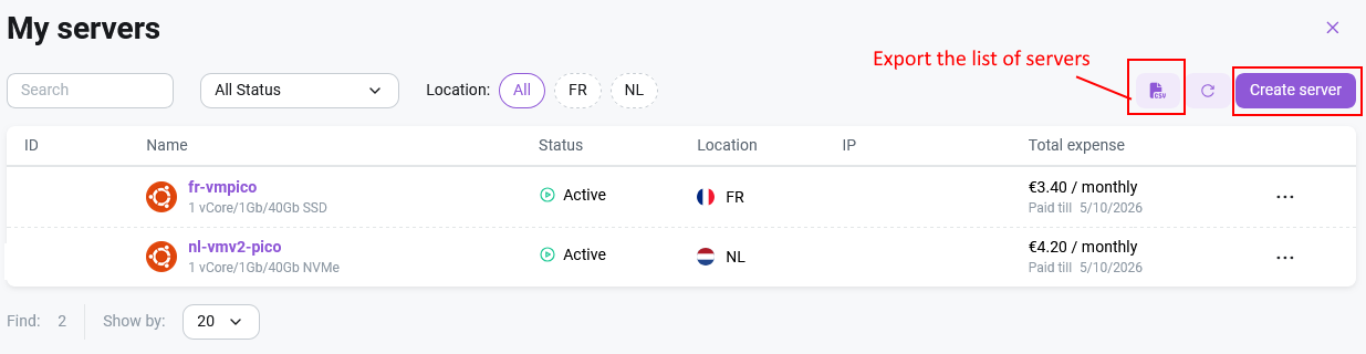 The panel displays a list of servers with filtering options by location (NL - Netherlands, US - USA, FI - Finland, DE - Germany, IS - Iceland, TR - Turkey, UK - UK, ES - Spain, IT - Italy, PL - Poland, CH - Switzerland) and status. Users can filter for servers with overdue payments having the status Pending payment, as well as use the button to export the list of all servers. The search window allows you to select a server by entering its ID, assigned tag, or IP address.