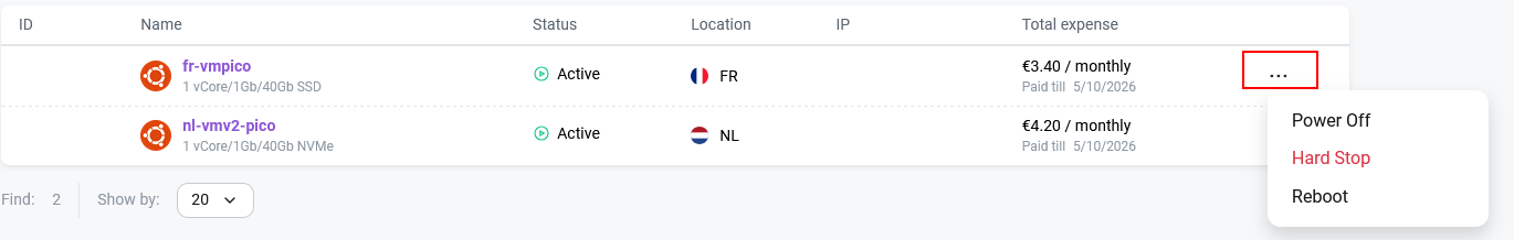 Clicking the ... icon activates the quick power management mode for the server.