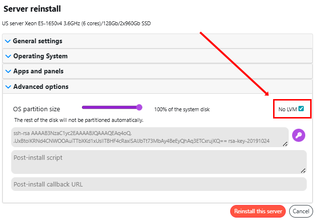 L'option No LVM est accessible à partir de l'interface de réinstallation du serveur sous Advanced options :
