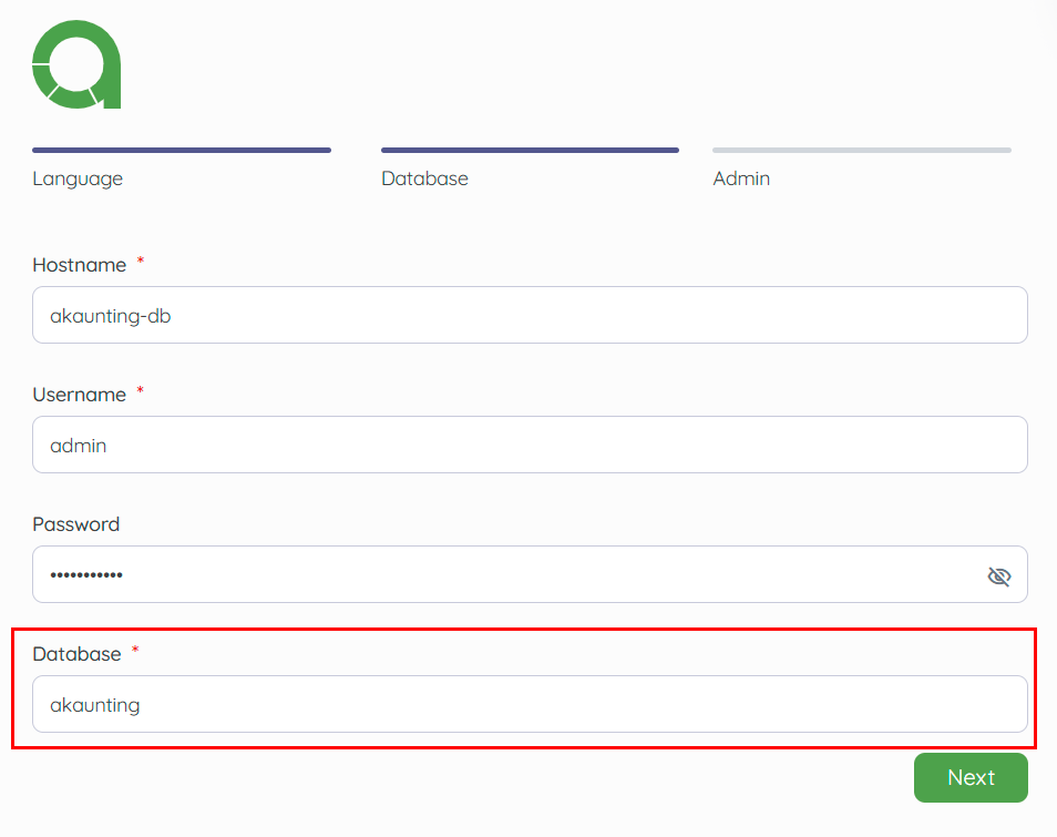 Vous pouvez consulter les paramètres de la base de données dans la configuration docker-compose située à /opt/akaunting.