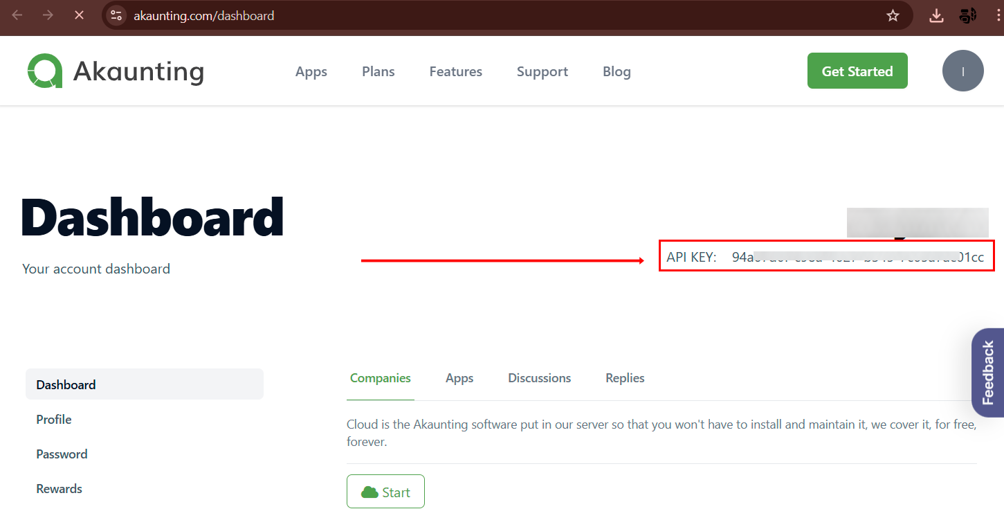 - Sur la page principale (Tableau de bord), trouvez le champ API Key ;