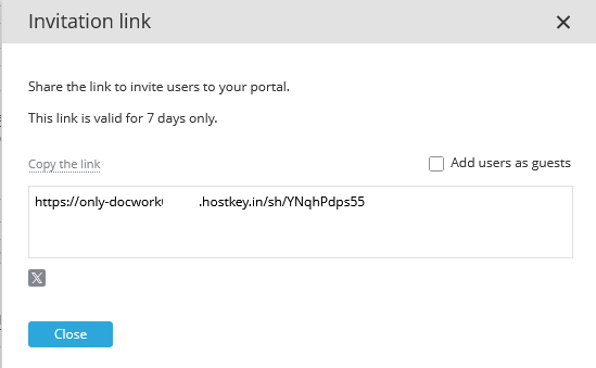 Invite Users to portal. Un lien spécial sera créé qui pourra être envoyé à plusieurs utilisateurs pour une auto-inscription. La période d'expiration du lien est de 7 jours.