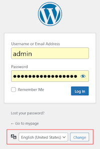 - Après l'installation de Wordpress, vous devez réentrer le Login et le Password de l'administrateur. Dans cette fenêtre, vous pouvez également re-sélectionner la langue de l'application. Cliquez sur