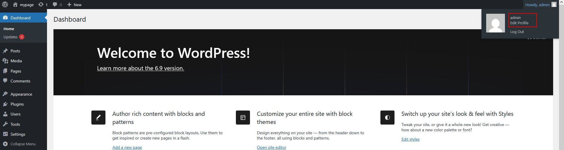 - Dans la fenêtre ouverte, vous pouvez continuer à travailler sur votre page. Pour changer les informations d'identification de l'administrateur, cliquez sur le profil en haut de la page et sélectionnez le menu Edit Profile.