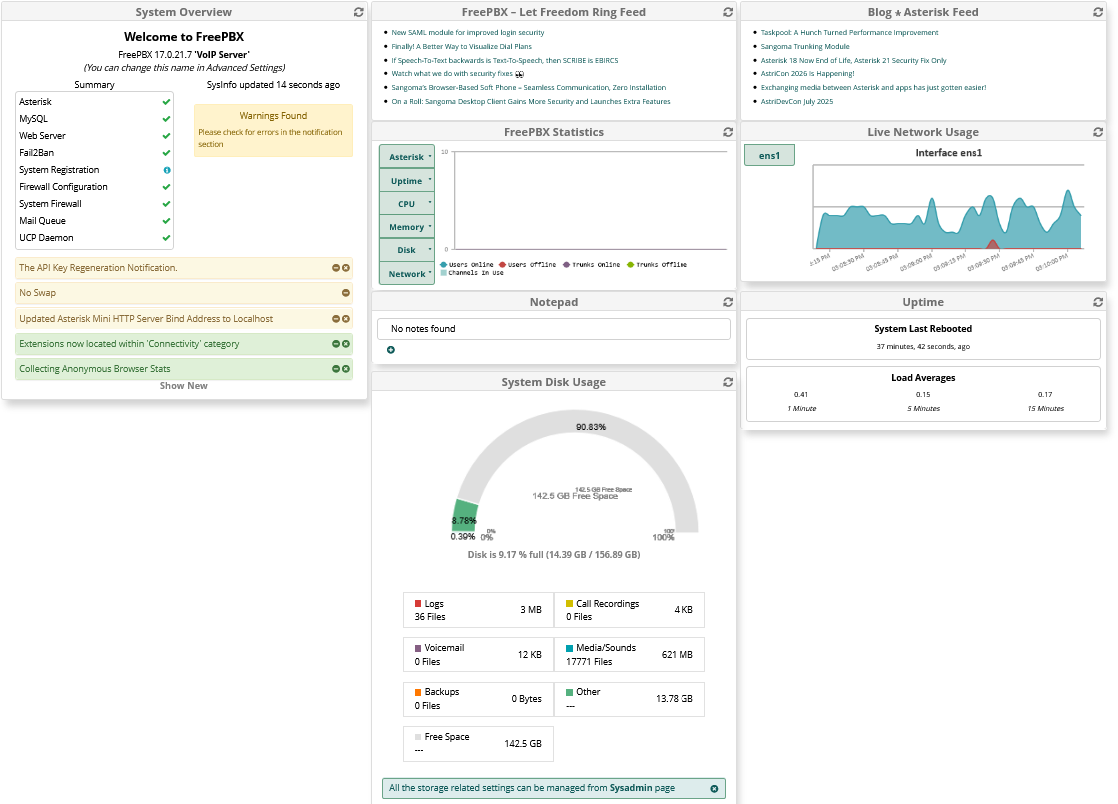 - FreePBX Statistic - fournit un affichage graphique de l'activité des utilisateurs, des troncs et des canaux, ainsi que leur impact sur la mémoire, le CPU, le disque et l'utilisation du réseau.