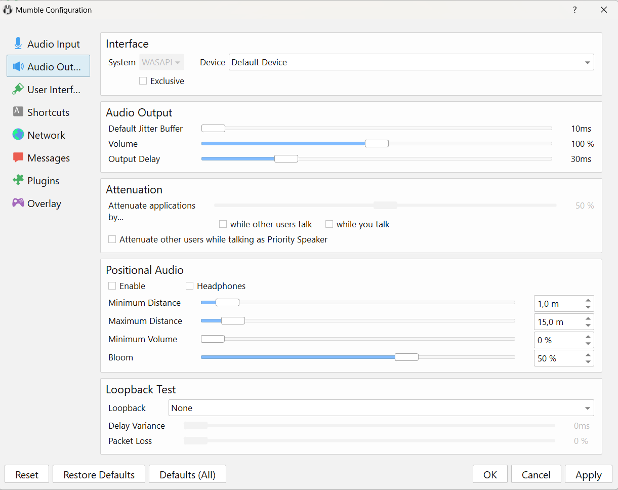 Après la connexion au serveur, il est recommandé de configurer le client Mumble. Tous les paramètres sont disponibles dans le menu Configure → Settings dans les versions de bureau ou dans les paramètres de l'application sur les clients mobiles.