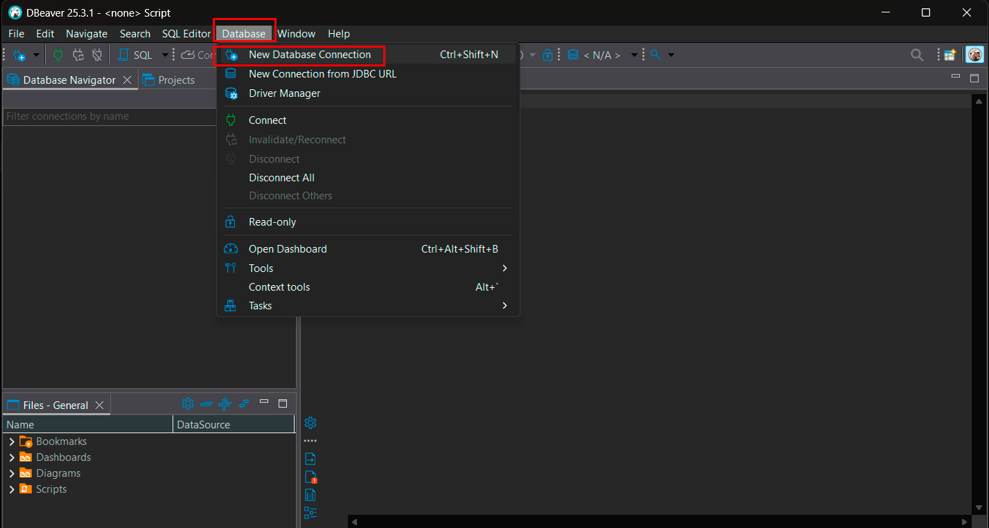 - Sélectionnez Database >> New Database Connection (ou appuyez sur