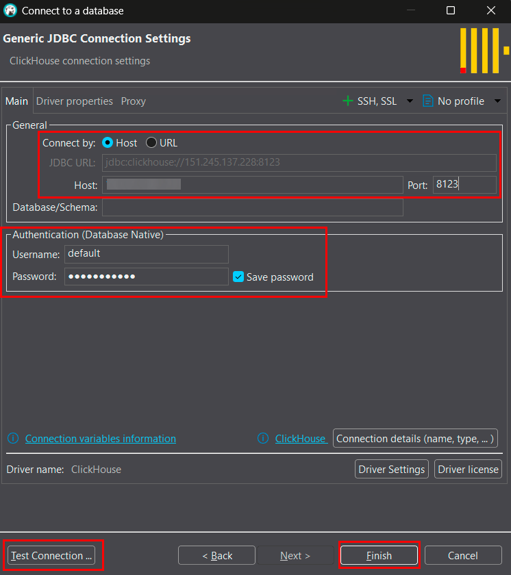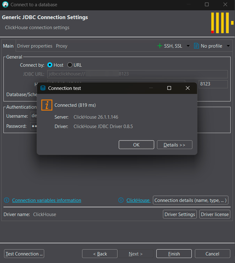 - Driver: ClickHouse JDBC Driver X.X.X