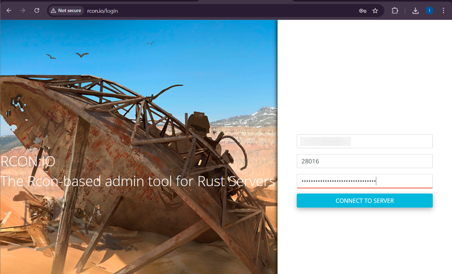 Ouvrez rcon.io à l'adresse http://rcon.io (sans HTTPS). En cas d'ouverture via HTTPS, le navigateur bloquera la connexion WebSocket non chiffrée avec le serveur et la connexion échouera.