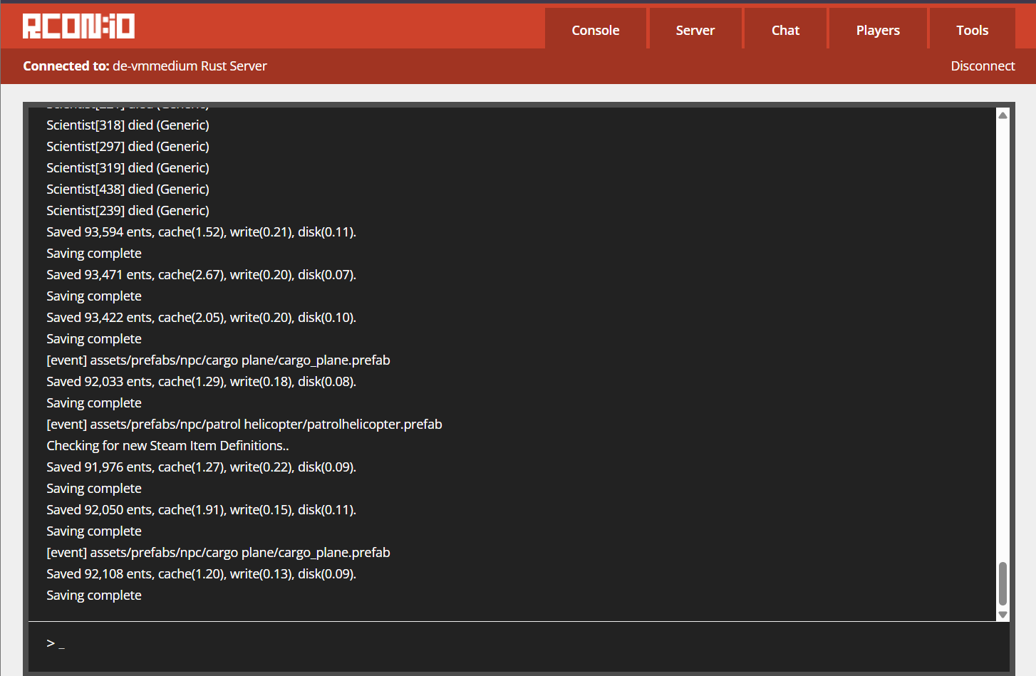 En plus de rcon.io, vous pouvez également utiliser RustAdmin (https://www.rustadmin.com/) — un client RCON de bureau avec des fonctionnalités avancées de surveillance, de gestion des bannissements et de statistiques des joueurs.