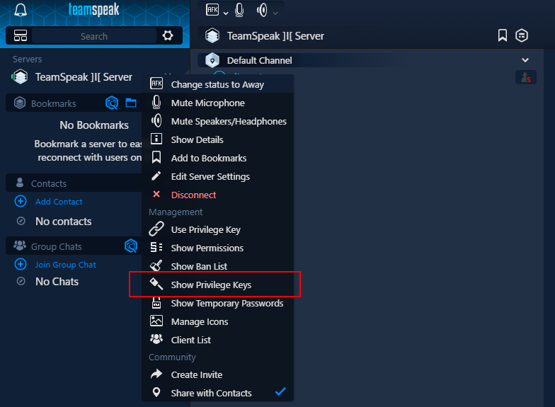 - Open the context menu by right-clicking on the server icon in the main TeamSpeak window.