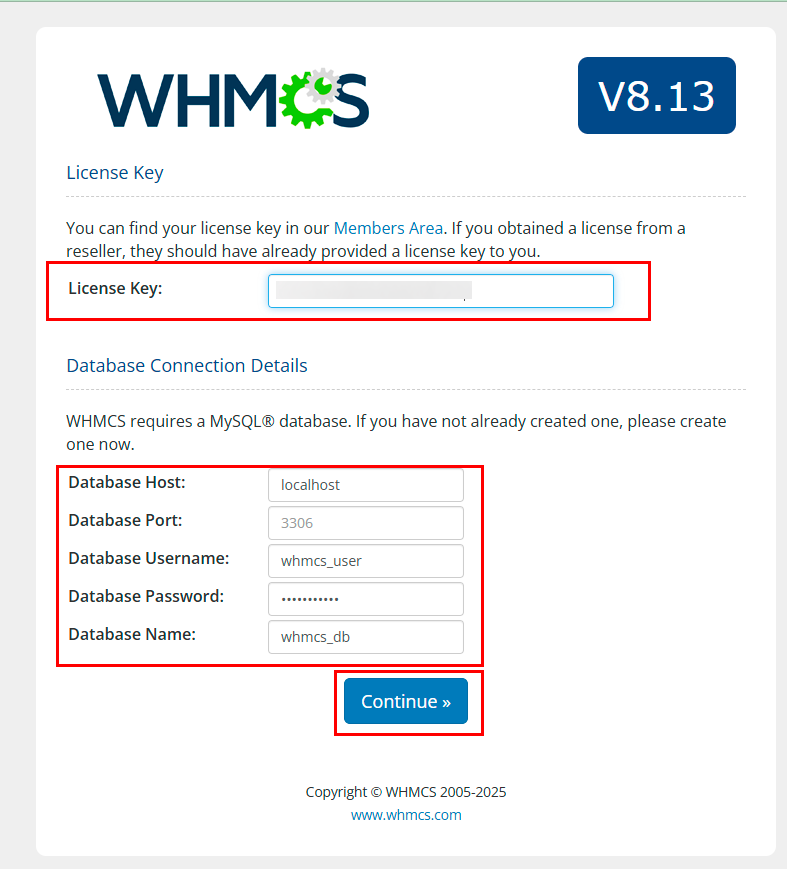 whmcs_user(nom d'utilisateur de la base de données) ; - Database Password : entrez le mot de passe pour l'accès à la base de données (correspond au mot de passe pour la connexion SSH au serveur) ;