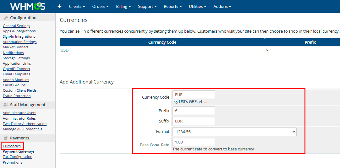 Par défaut, le système est configuré pour USD. Pour ajouter une nouvelle devise (par exemple, EUR) :