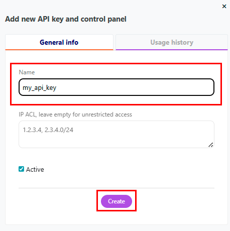 my_api_key) ; - Dans le champ IP ACL, vous pouvez spécifier des adresses IP pour restreindre l'accès (laissez vide pour un accès non restreint) ;