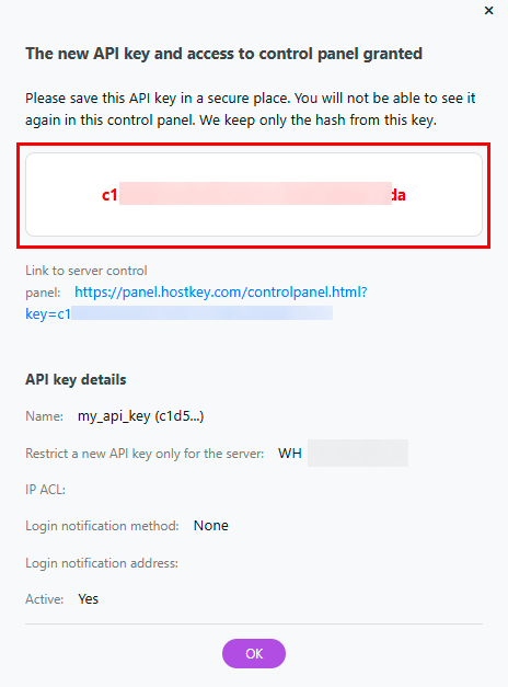 - Cette clé ne sera plus affichée dans le panneau de contrôle - seul son hash est sauvegardé ;
