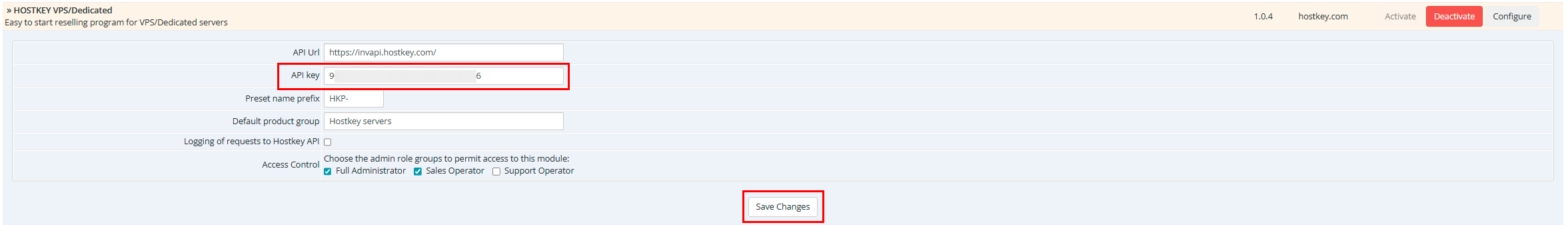 Après avoir activé le module HOSTKEY VPS/Dedicated dans la section Addon Modules, vous devez configurer les clés API pour l'intégration avec les services HOSTKEY.