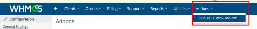 - Dans WHMCS, allez à Addons → HOSTKEY VPS/Dedicated ;