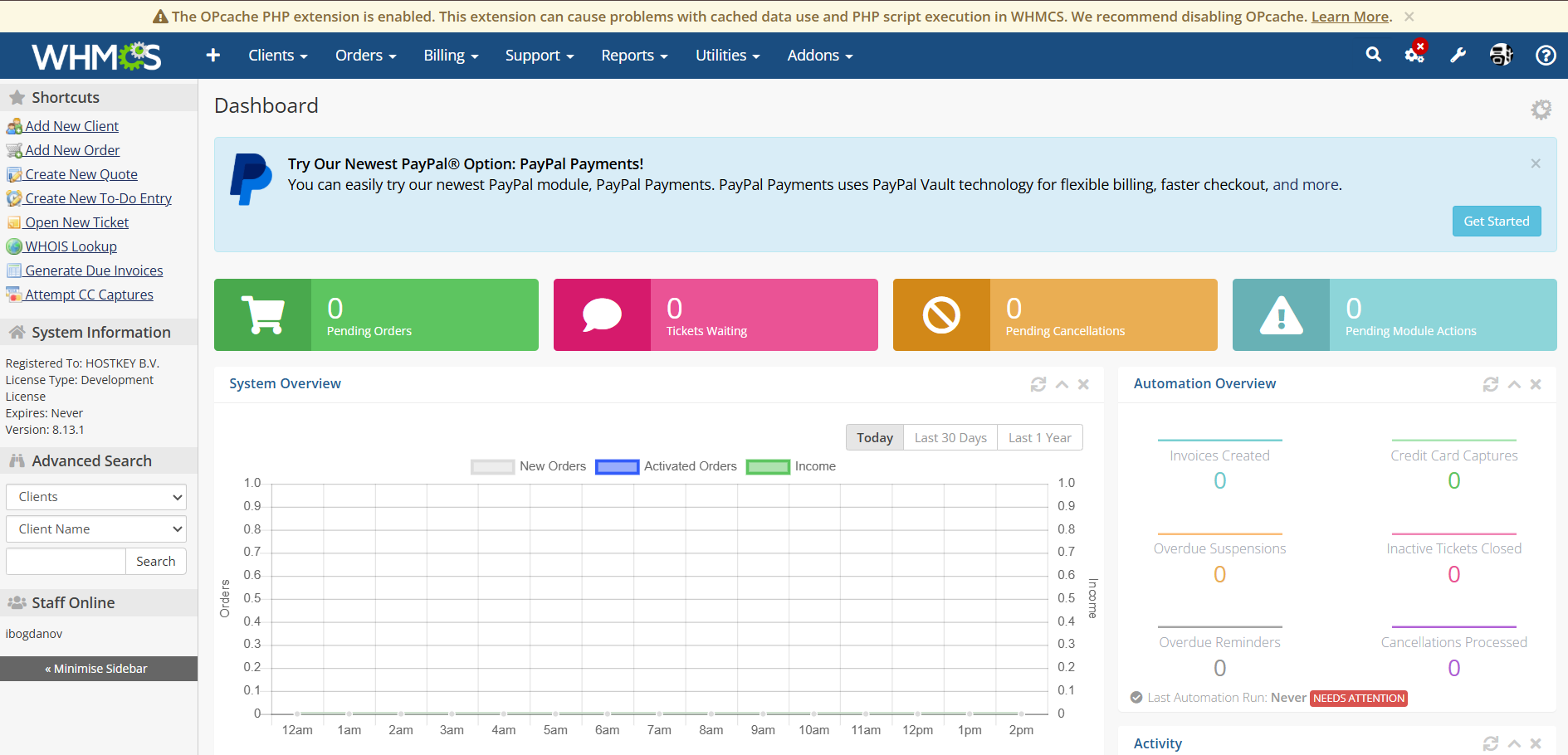 Après vous être connecté avec succès au panneau d'administration WHMCS, le tableau de bord principal de gestion s'ouvrira :