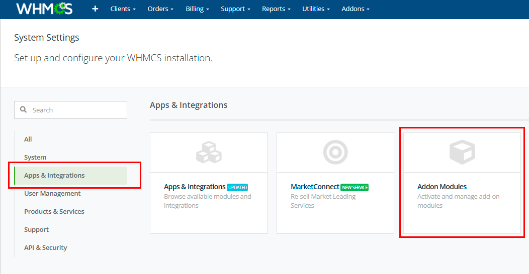 - Sélectionnez Addon Modules pour gérer les modules supplémentaires :