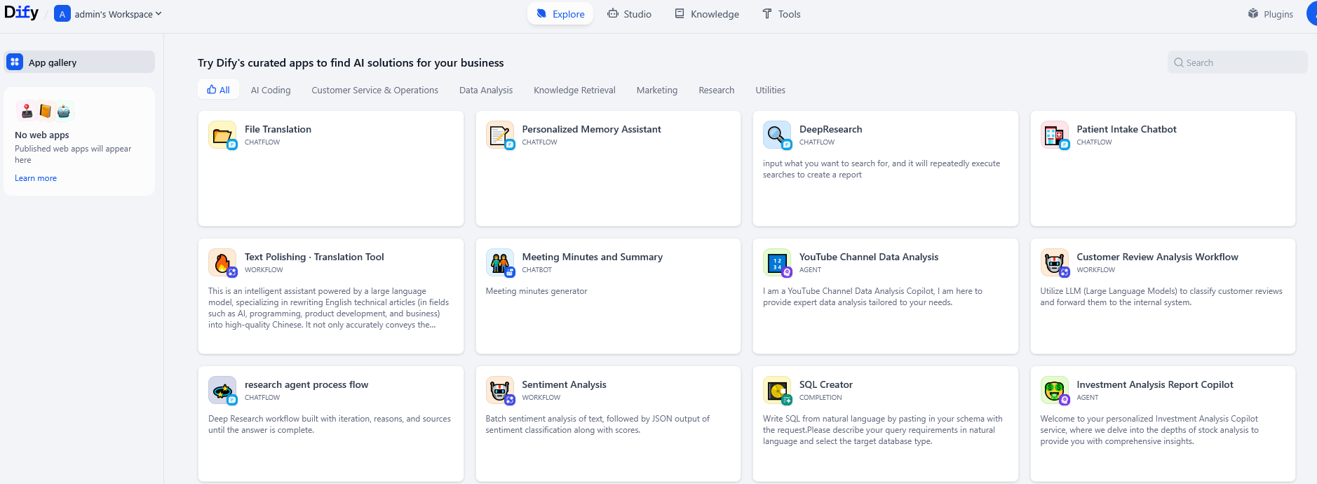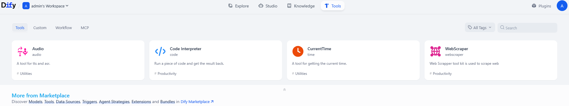 La section contient l'ensemble existant d'applications personnalisées prises en charge, réparties par type — agents, flux de travail, programmation et autres. Elle sert à se familiariser avec et à sélectionner les outils dont vous avez besoin.