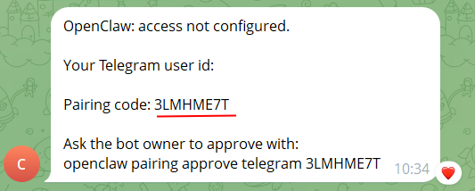 Allez sur Telegram, trouvez et lancez le bot créé. Le bot vous fournira un Pairing code pour l’appariement avec l’agent.