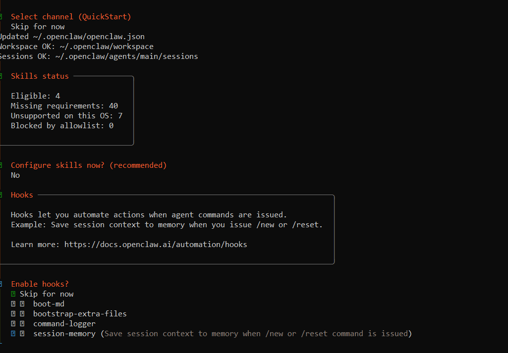 Pour ignorer la configuration des commandes utilisateur automatiques à l'étape Enable hooks?, appuyer sur Space et Enter.