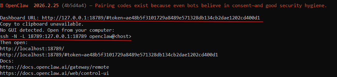 Vous devrez peut-être ressaisir le mot de passe pour accéder au serveur. Appuyez sur Enter – Clawbot créera un tunnel pour une utilisation sur la machine locale.