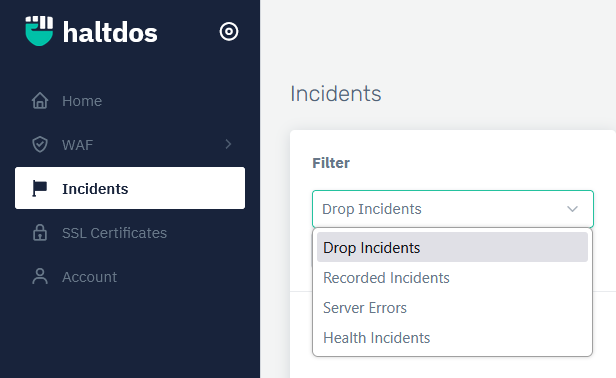 - Incidents — affiche les statistiques des incidents avec une option de filtrage par type d'incident.