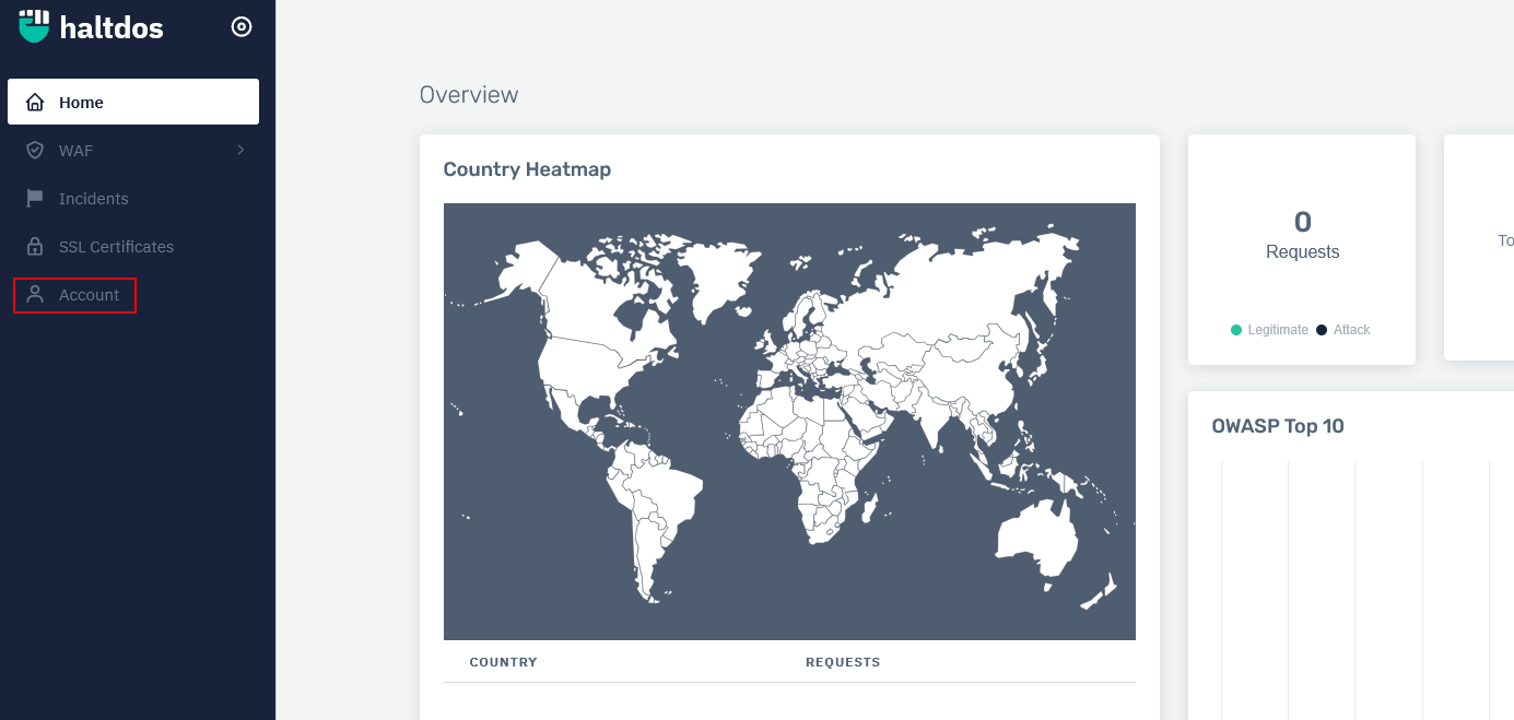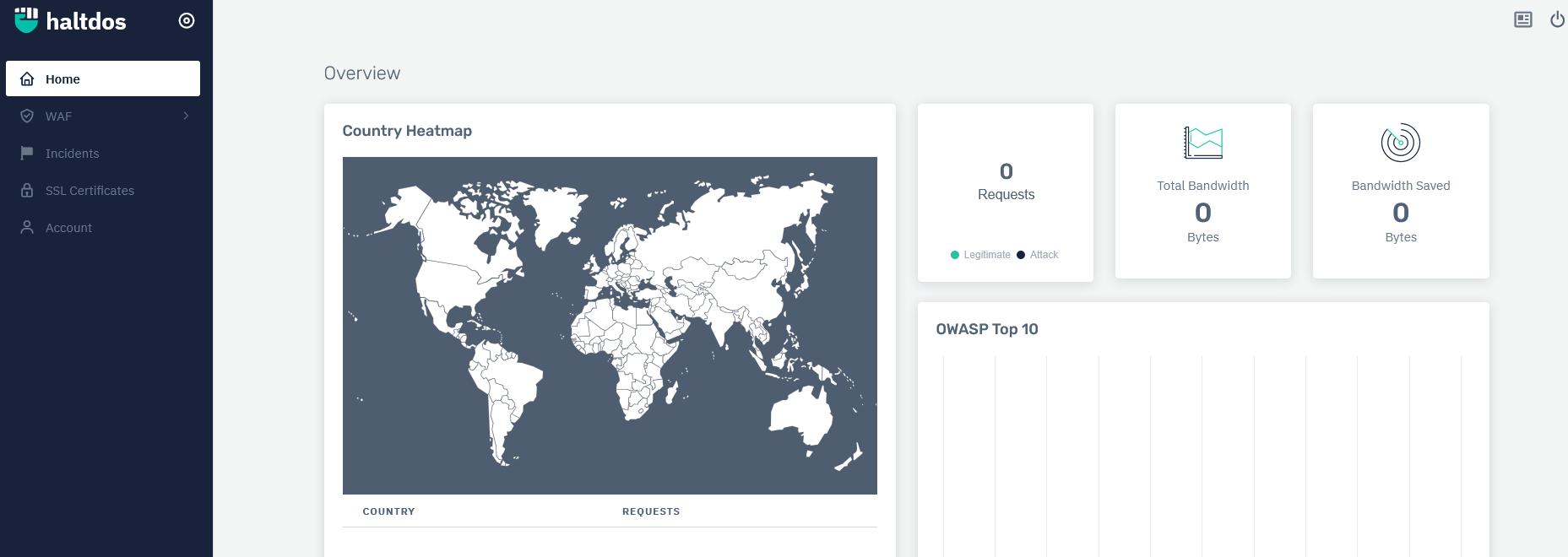 Après une connexion réussie, vous serez dirigé vers l'écran d'accueil du Haltdos Community WAF fournissant un aperçu de l'état du système de sécurité :