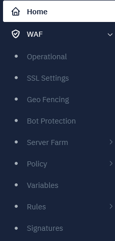 - WAF — affiche les paramètres d'exploitation et permet d'appliquer les réglages nécessaires pour le WAF - pare-feu au niveau de l'application. Dans ce menu, vous pouvez configurer les paramètres SSL, la géolocalisation, la protection anti-bot, et établir l'ordre d'application des règles standard et personnalisées.