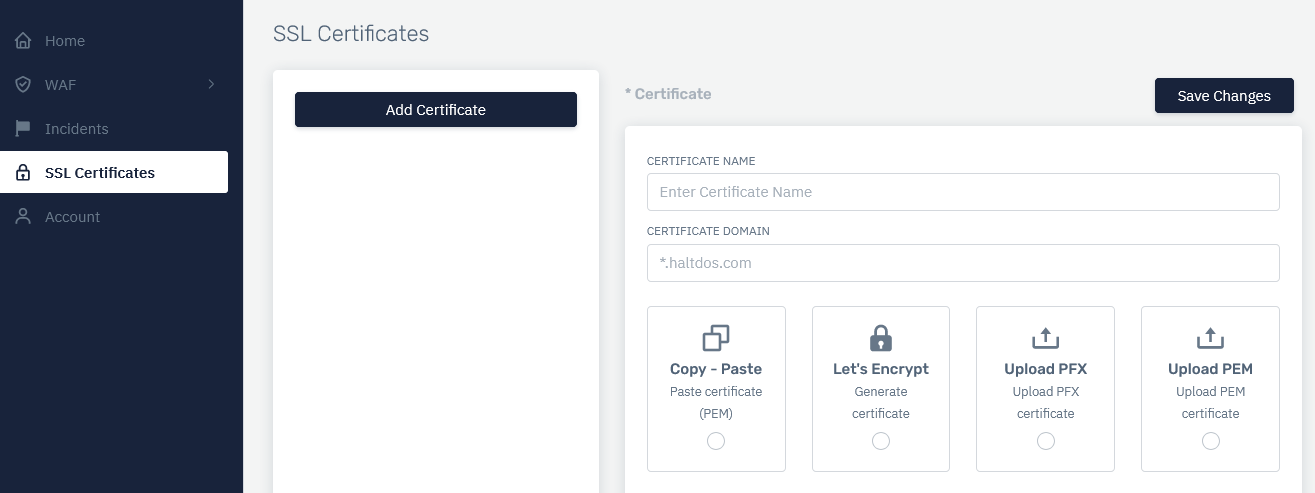- SSL Certificates — affiche les statistiques d'utilisation des certificats SSL. Ce menu organise également le processus pour ajouter des certificats.