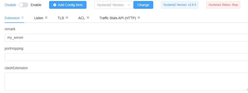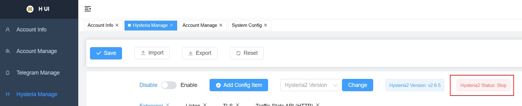 Avant d’utiliser le service, vous devez configurer le serveur proxy Hysteria2. Accédez à l’onglet Hysteria Manage. Vous verrez une notification Hysteria2 Status:Stop.